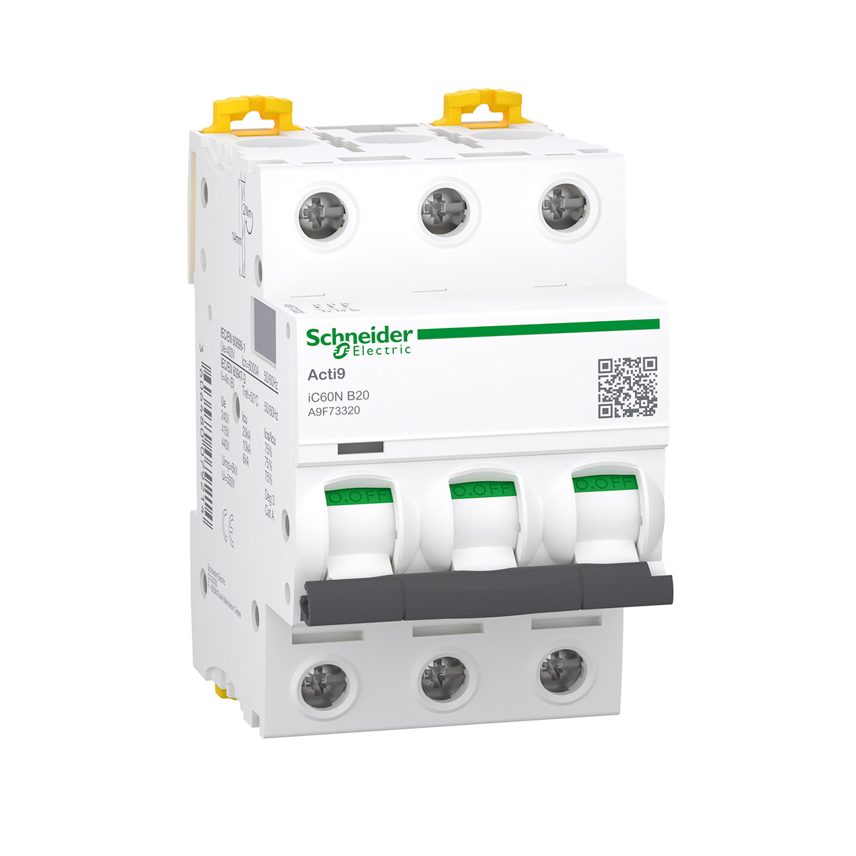 کلید مينياتوری سه فاز 20 آمپر 6kA اشنایدر روشنایی AC/DC کد فنی: A9F73320